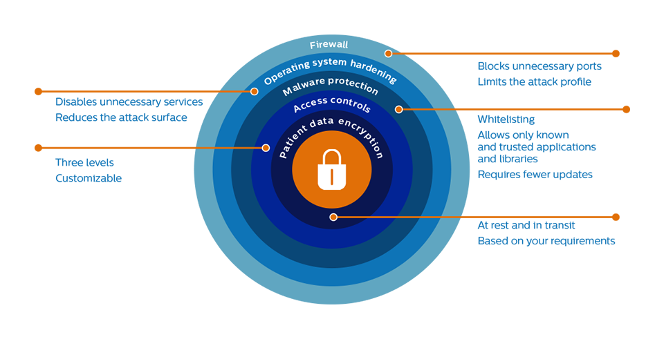 As key assets within a hospital’s network, Ultrasound devices are vulnerable to data security breaches – however most Ultrasound systems are developed only for clinical capability, not security. Not at Philips. Our portfolio of EPIQ, Affiniti, CX50, and SPARQ Ultrasound systems are built around the defense-in-depth principle and deliver an outstanding set of data security features comprising of five core layers;
